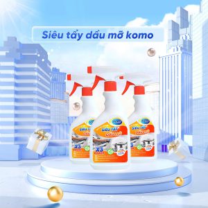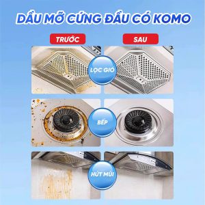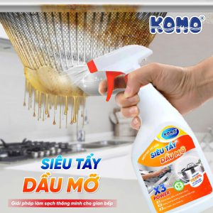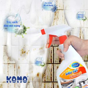 - Tẩy Siêu Mỡ KOMO giúp làm sạch nhanh và hiệu quả dầu mỡ, mảng bám lâu ngày và vết cháy khét trên bếp gas, bếp từ, máy hút mùi, tường và sàn nhà bếp.