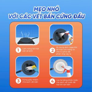 Đánh bật dầu mỡ cháy khét và mảng bám cứng đầu mà không gây ăn mòn bề mặt bếp và thiết bị nhà bếp.
